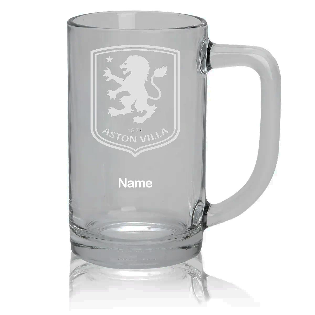 Seamless glass tankard with 440ml full beer can capacity.High-quality Aston Villa FC logo and your name engraved into the glass.Dishwasher safe glass engraving that does not fade or splinter.1 pint is 568ml.