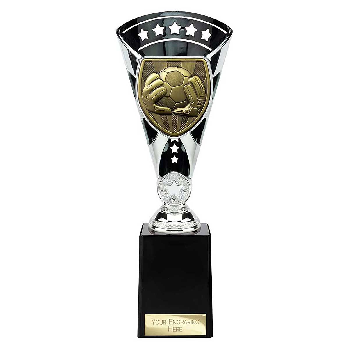 Silver and black Cobra Star Cup with gold goalkeeperinsert and club badge holder. Heavy black plastic base with a gold name plate