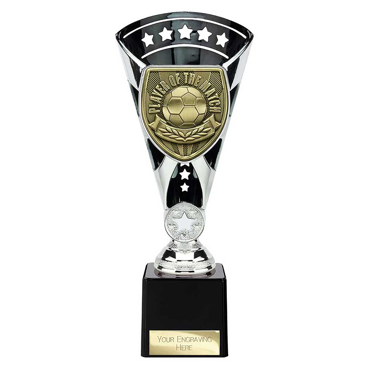 Cobra Star Player of the Match Trophy 230mm high. A black & silver metal cup on a black marble column witha pressed metal gold insert.Engraving plate and club logo can be applied to front.