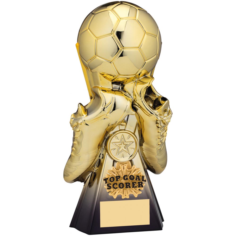 Black and gold Gravity Managers Player award 26cm highFeatures gold and black ball and gold boots on a black columnComes with a gold and black achievement plaqueEngraving plate and club logo can be applied to front