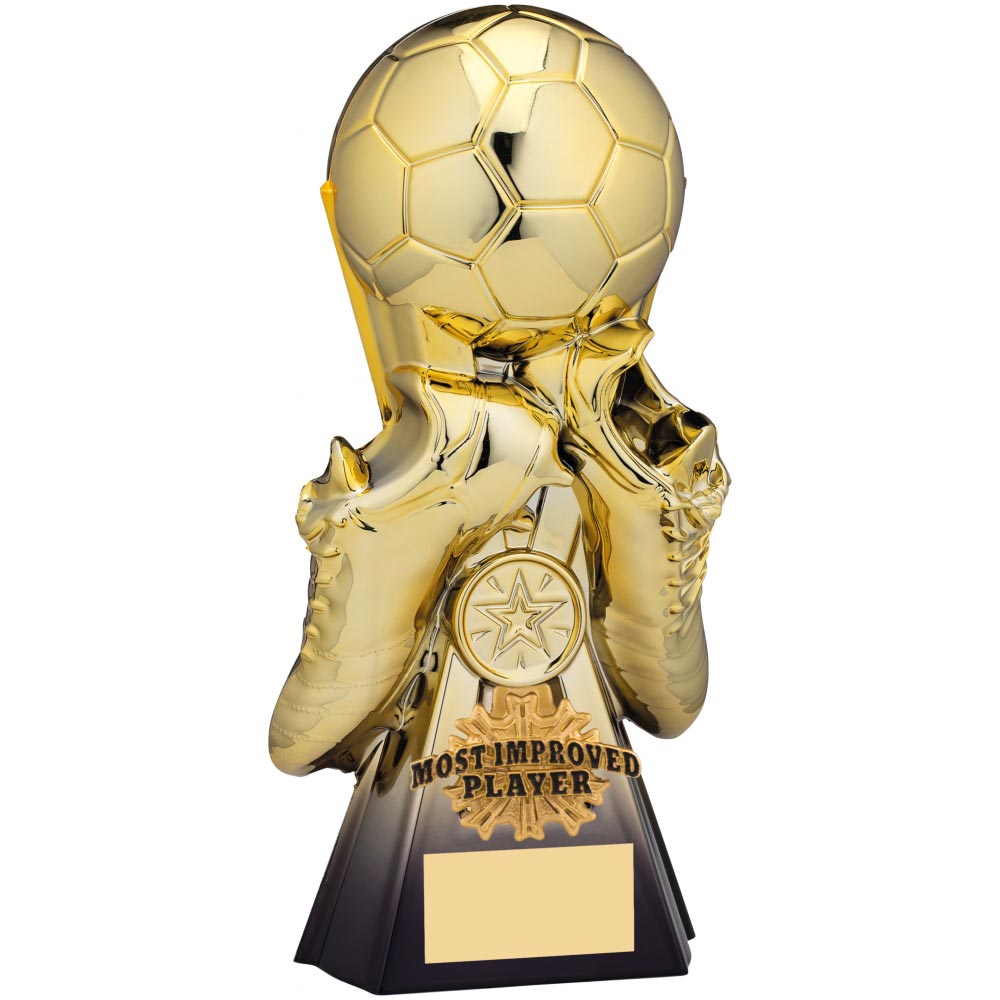 Black and gold Gravity Most Improved Player of the Year award 26cm highFeatures gold and black ball and gold boots on a black columnComes with a gold and black achievement plaqueEngraving plate and club logo can be applied to front