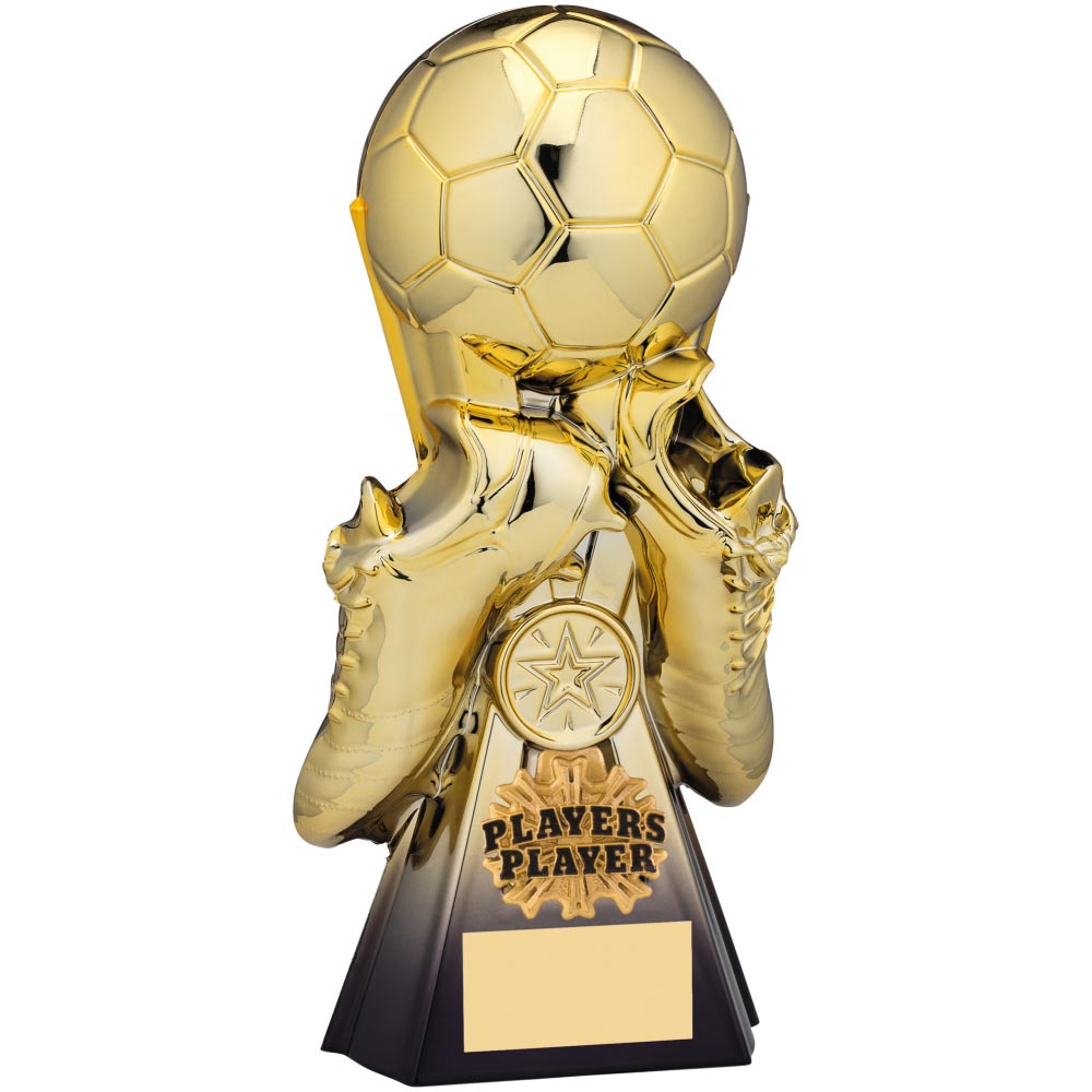 Black and gold Gravity Players Player award 26cm highFeatures gold and black ball and gold boots on a black columnComes with a gold and black achievement plaqueEngraving plate and club logo can be applied to front