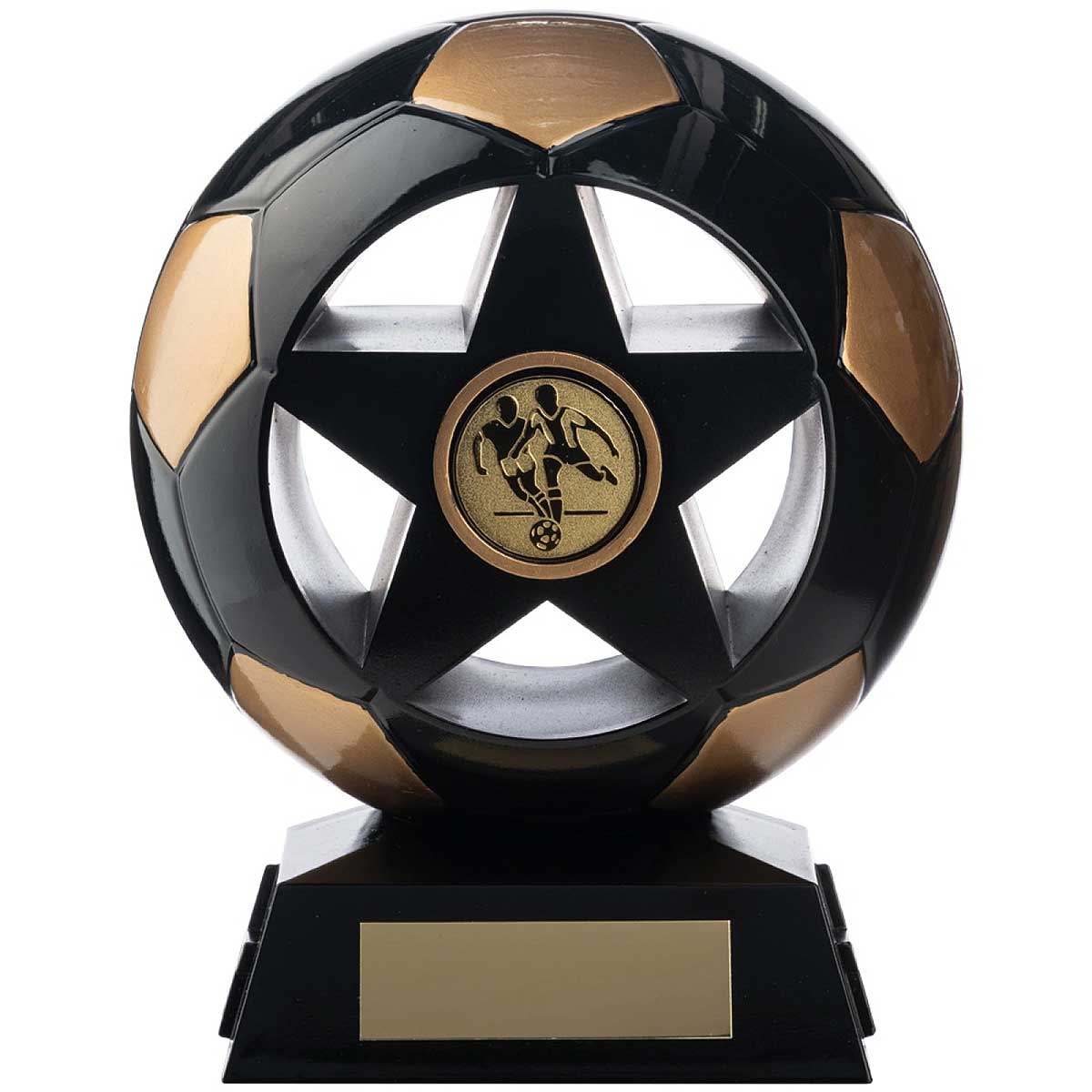 Nova Focus antique black ball trophy 145mm on a shiny hard shell with gold ball patch. Engraved plate and club logo options.
