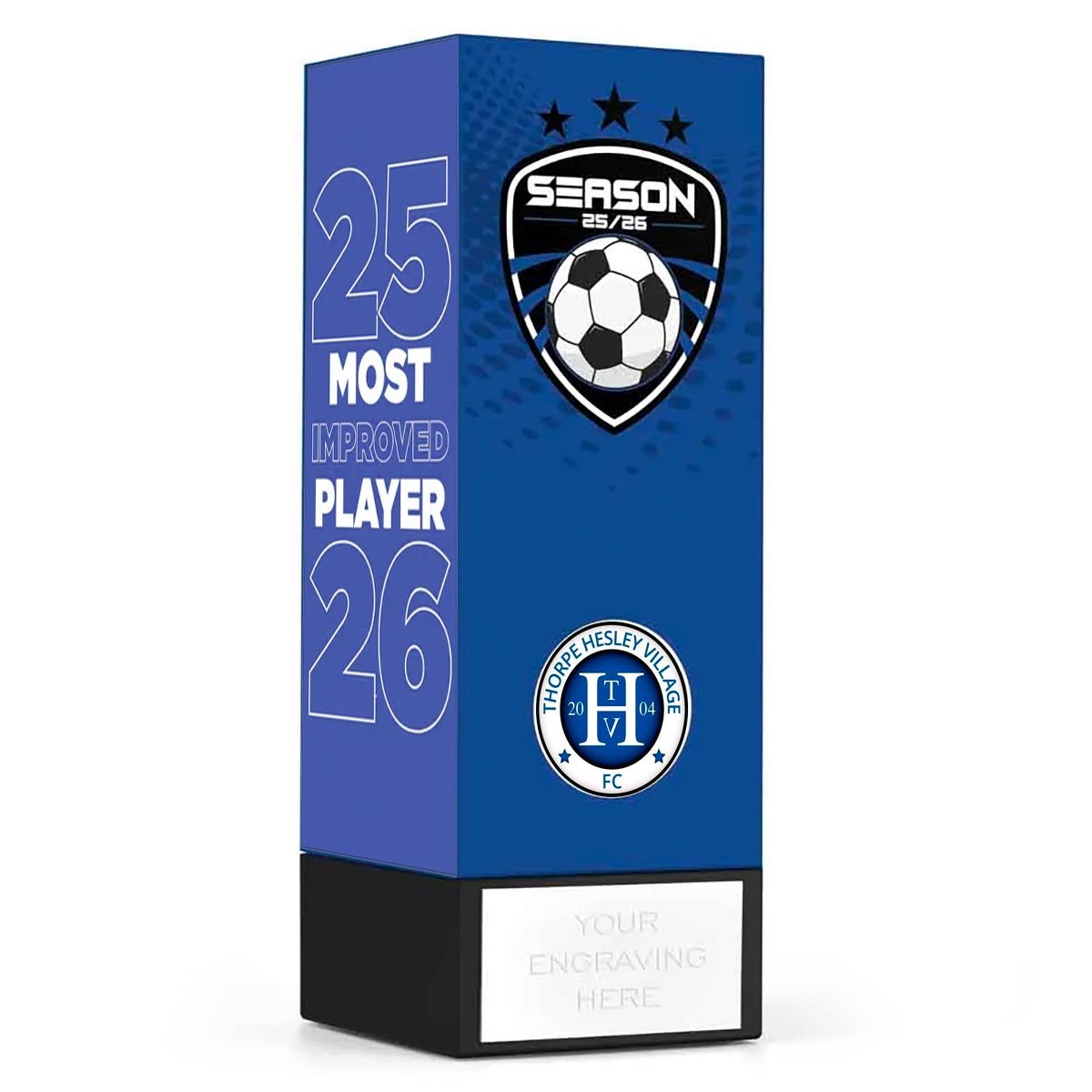 Blue Geo Block 6cm square plain plastic column, 17cm tall. Weighted 0.6kg black base to give it a quality feel with felt foot.Comes with Icon Most Improved Player highlight panels