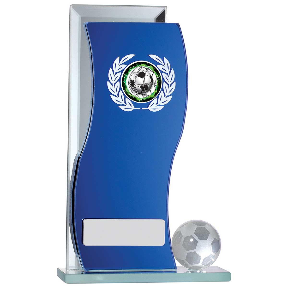 High-quality glass plaque with blue wave panel 165mmGlass football alongside a metal engraving plate and space for your club badge.
