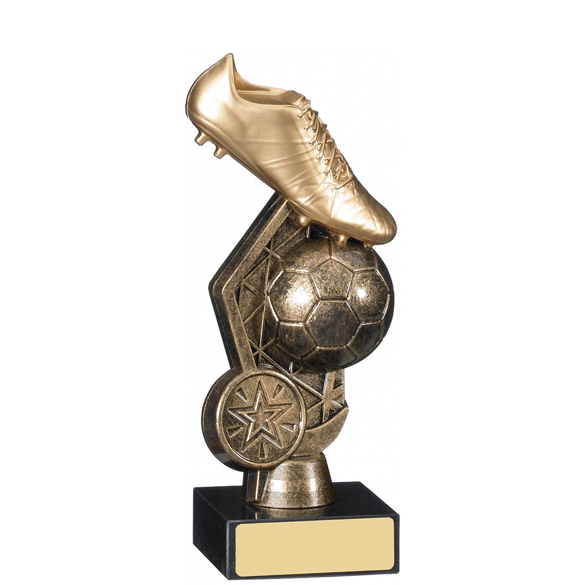 A bright gold plastic boot on top of a antique gold hex column with 3D football