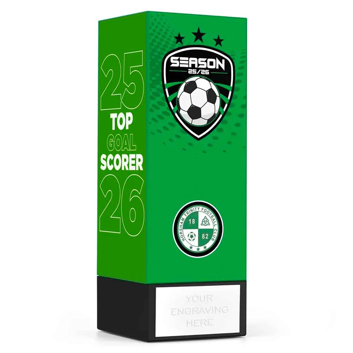 Green Geo Block 6cm square plain plastic column, 17cm tall. Weighted 0.6kg black base to give it a quality feel with felt foot.Comes with Icon Top Goal Scorer highlight panels
