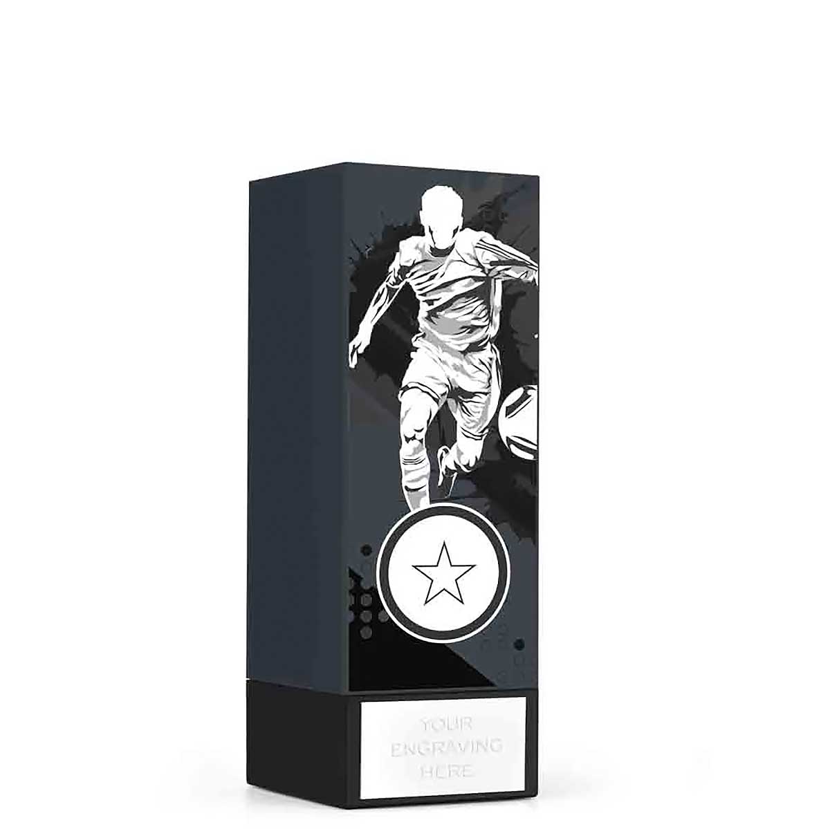 Grey Mini Geo football award. Evenly weighted smooth plastic with a modern male footballer gloss vinyl on the front.