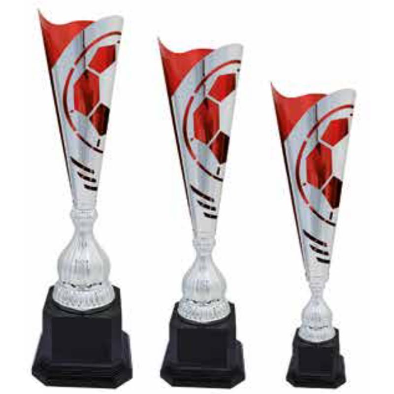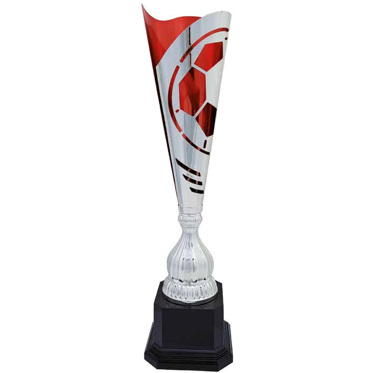 Tall conical red and silver cup 52cm highFeatures silver metal football against metallic red backgroundStands on a tall square black blastic baseEngraving plate and club badge can be applied to front