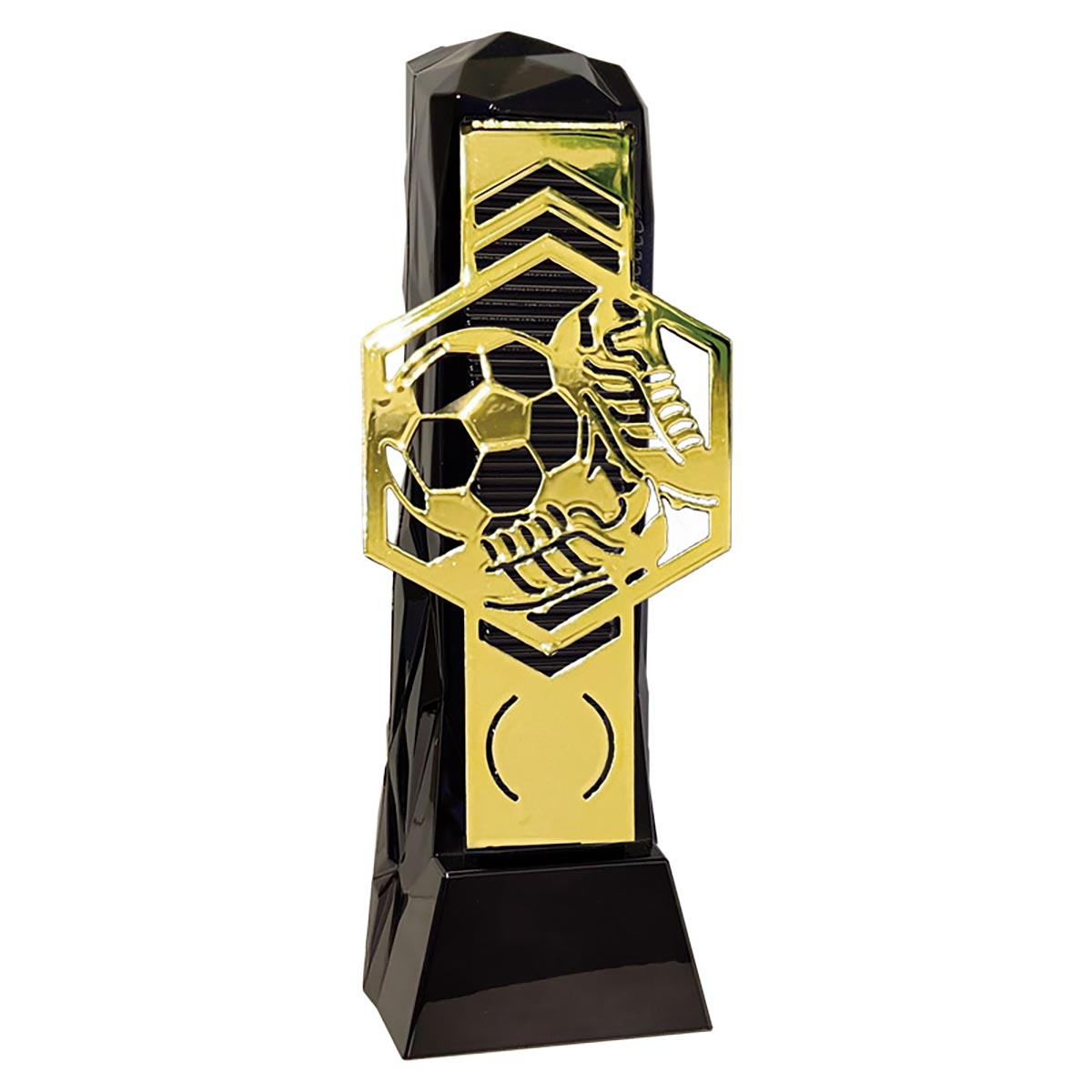 Large black plastic henge football trophy with gold football hex front. Engraving plate and club logo can be applied to the front.