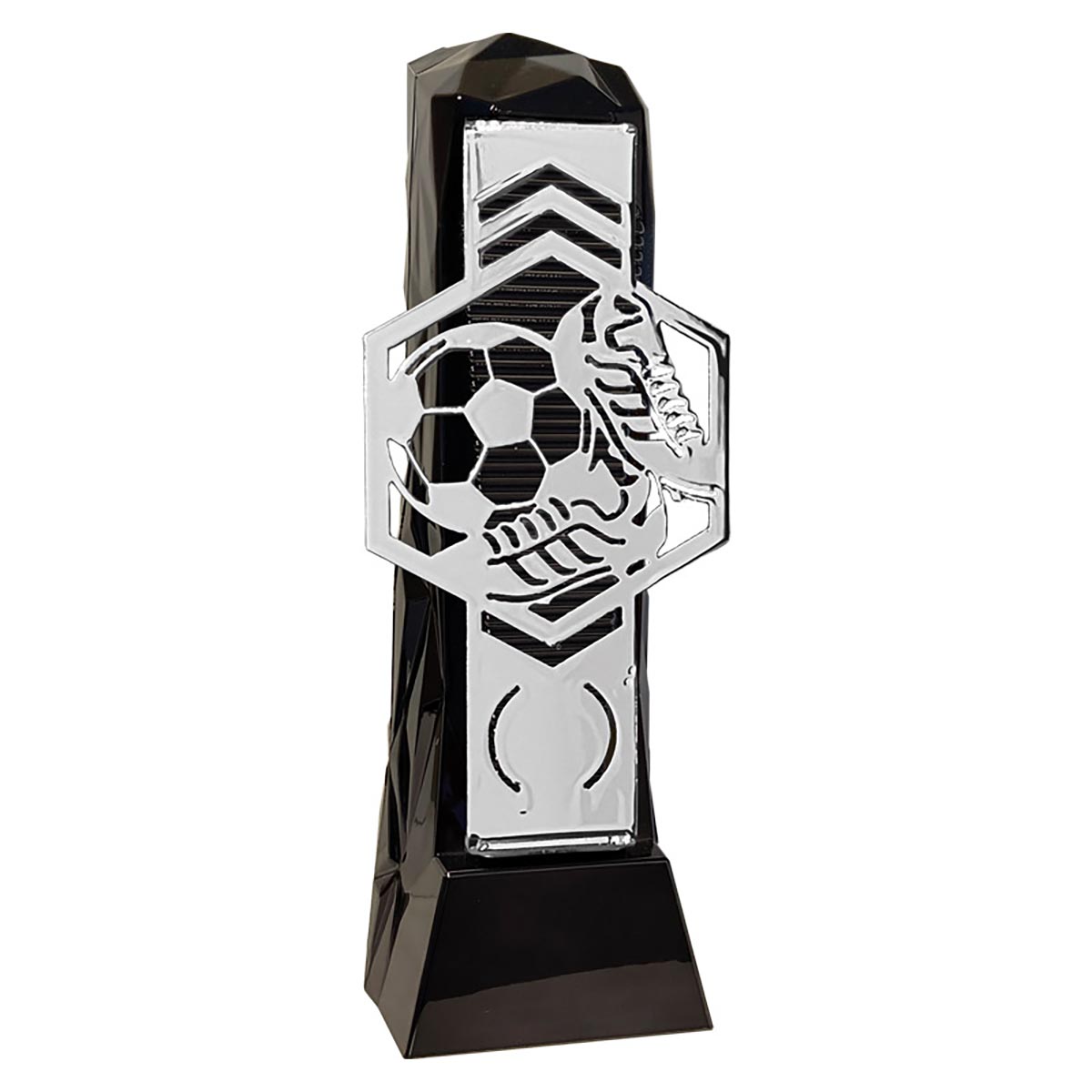 Large black plastic henge football trophy with silver football hex front. Engraving plate and club logo can be applied to the front.