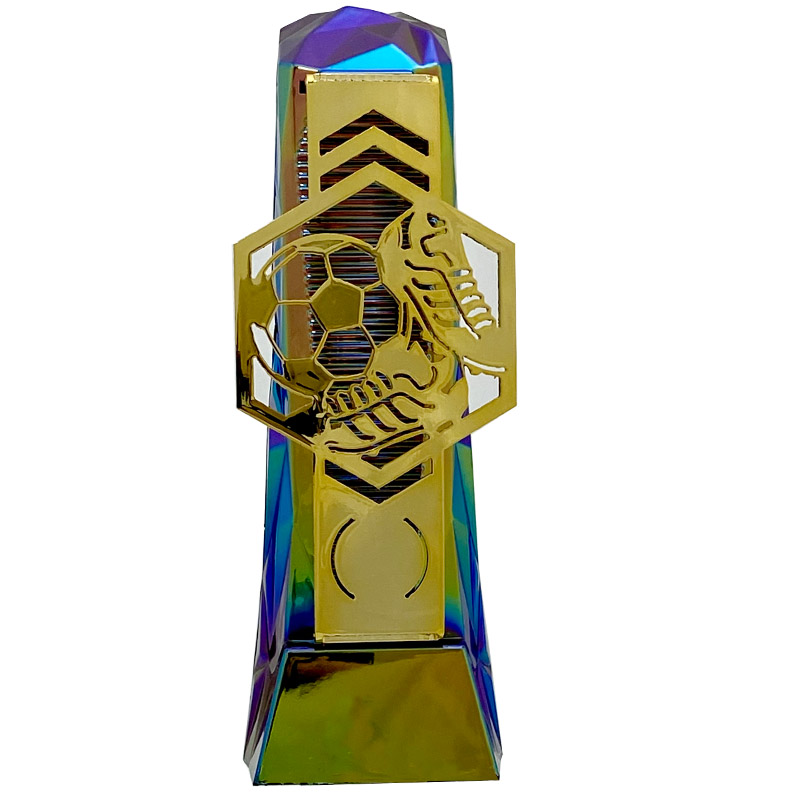 Large hydro plastic henge football trophy with gold football hex front. Engraving plate and club logo can be applied to the front.