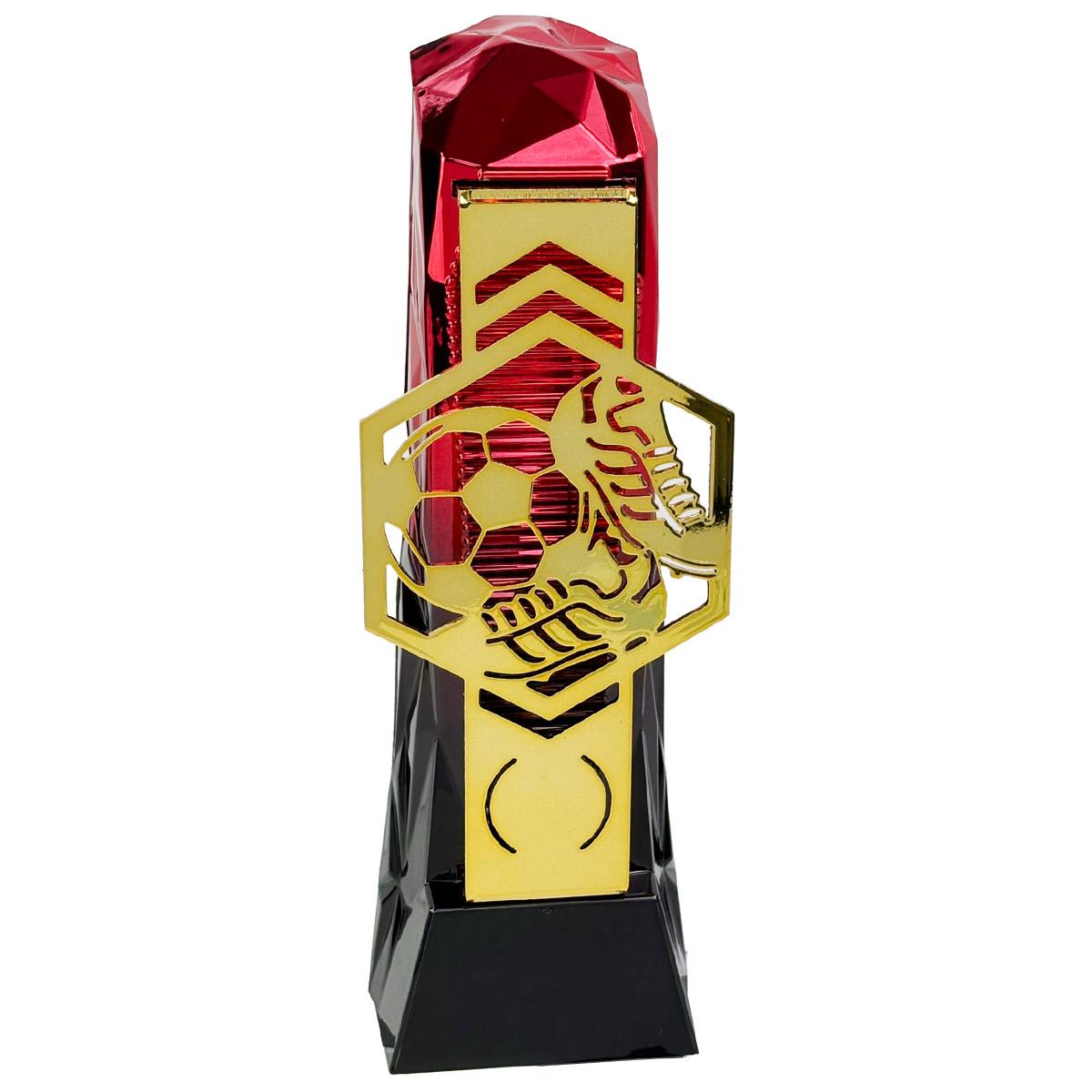 Large red plastic henge football trophy with gold football hex front. Engraving plate and club logo can be applied to the front.