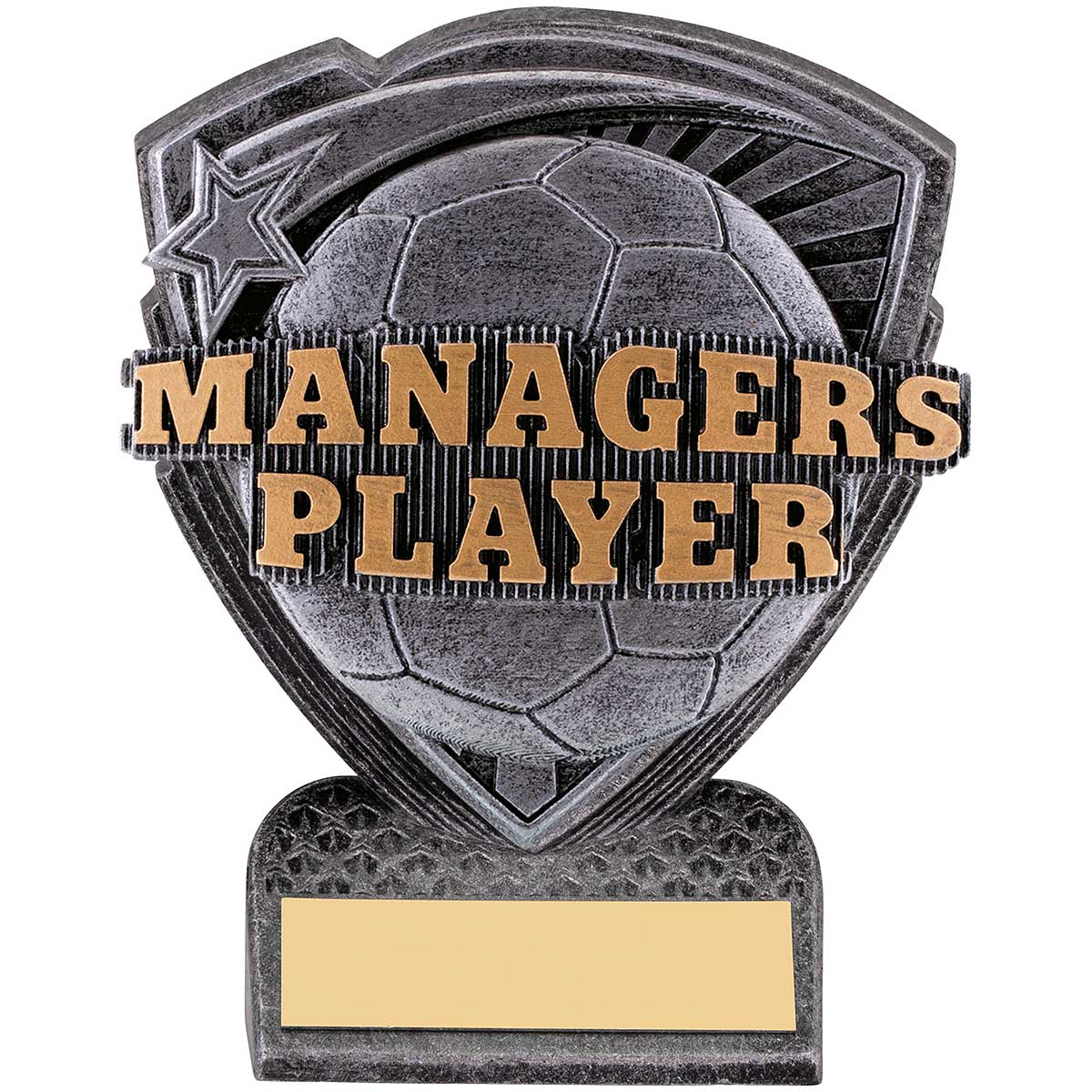 Managers Player Utopia award 10cm highFeatures gold text, trim and star on an antique silver column with integral resin baseEngraving plate can be applied to front