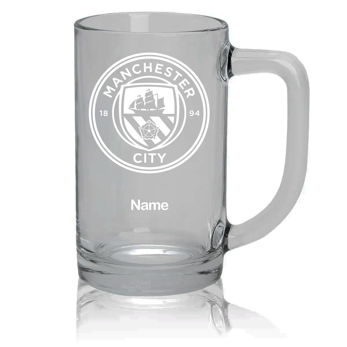 High-quality Manchester City FC logo and your name engraved into the glass.