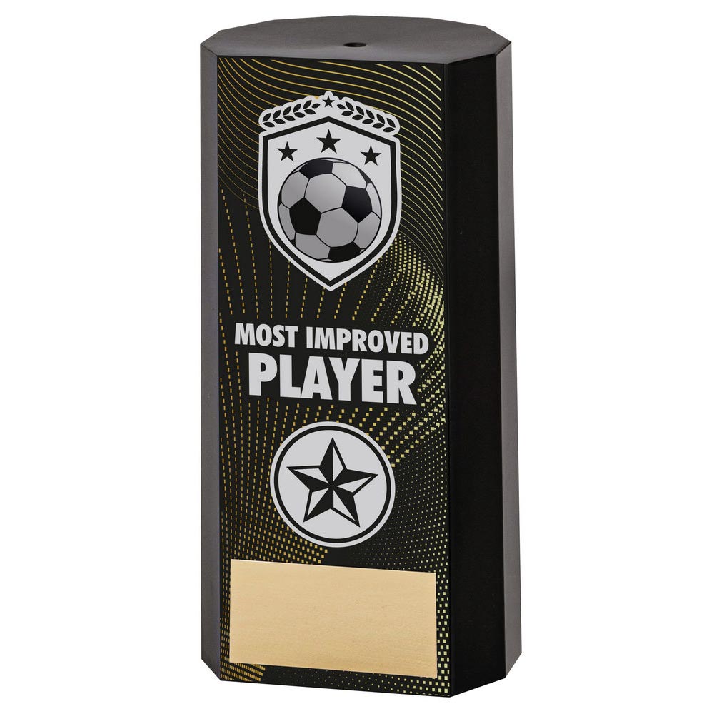 Most Improved Player black block football trophy 152mm tall. evenly weighted 0.6kg block to give it a quality feel.Chiselled angled edges for a modern look with football shield and laurel motif.Space for your club badge and engraved name plate.