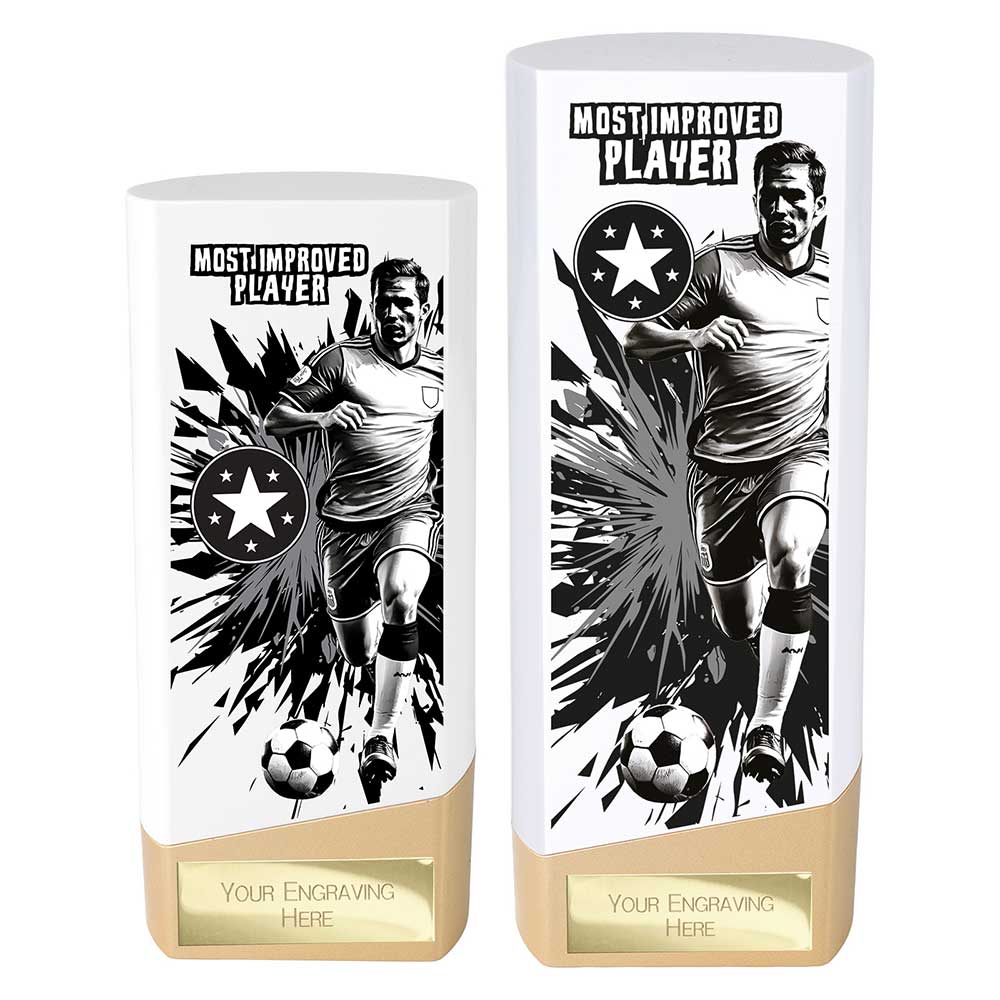Most Improved Player White Male Prime Football Trophy 160mm high. 1kg heavyweight plastic column with a slanted gold base.Glossy evenly weighted hard shell finish.Engraving plate and club logo can be applied to the front.
