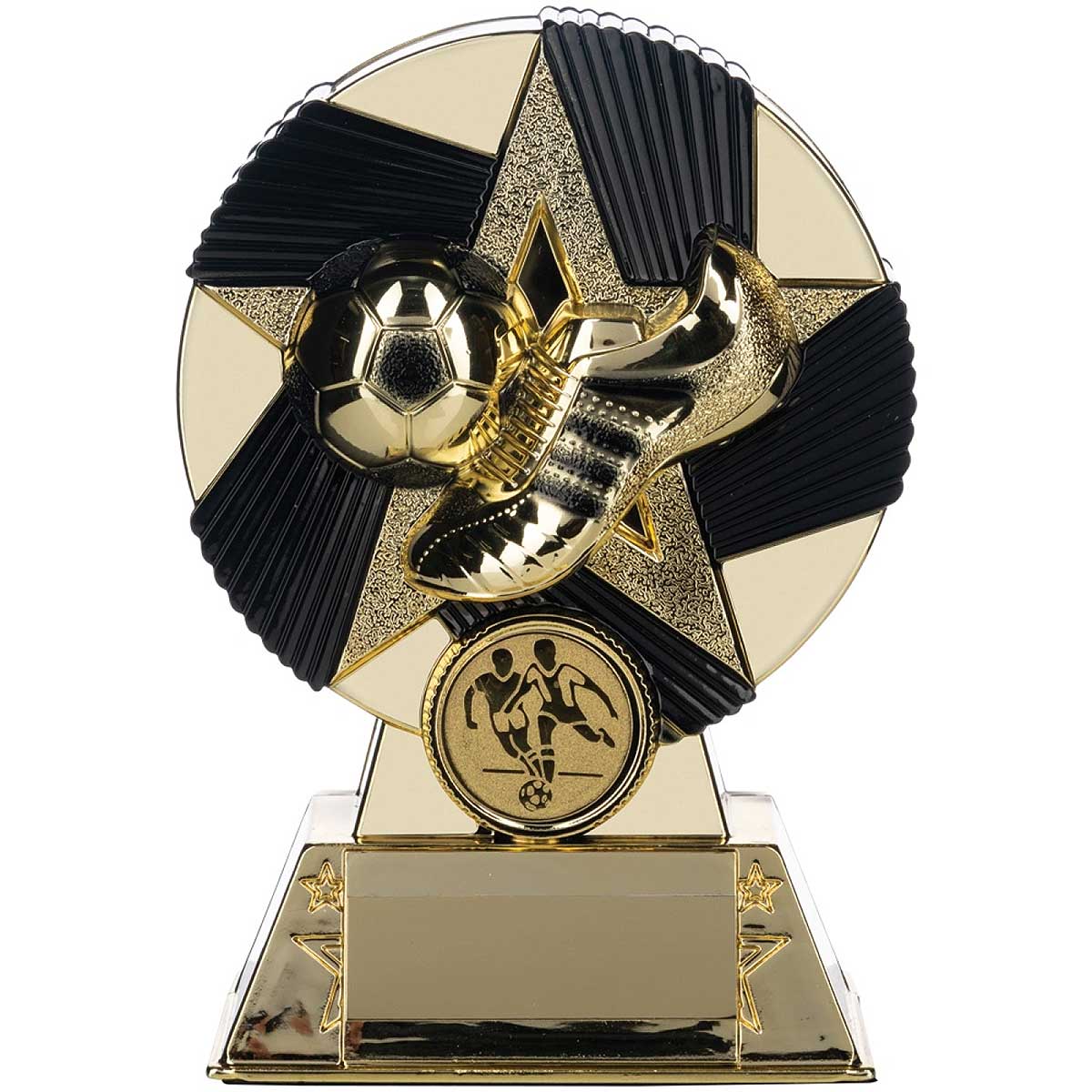 Nova Atlas gold boot and ball trophy 16cm on a shiny gold hard shell with black fluted disc background. Engraved plate and club logo options.