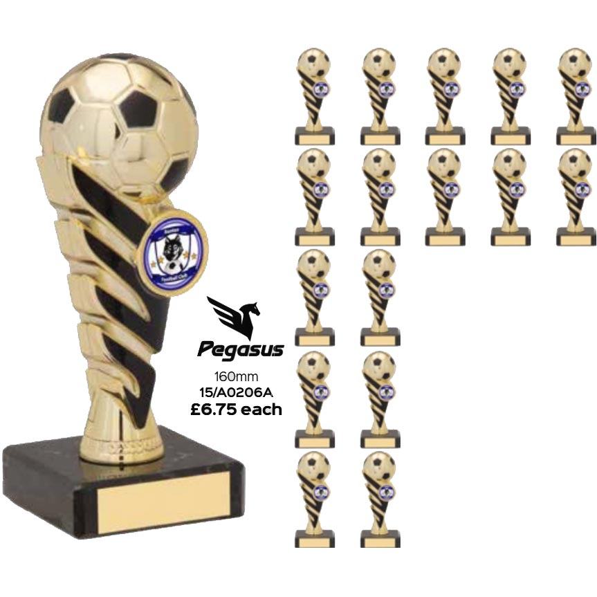 The bright gold & black plastic Pegasus football trophy retails at £6.75 each.