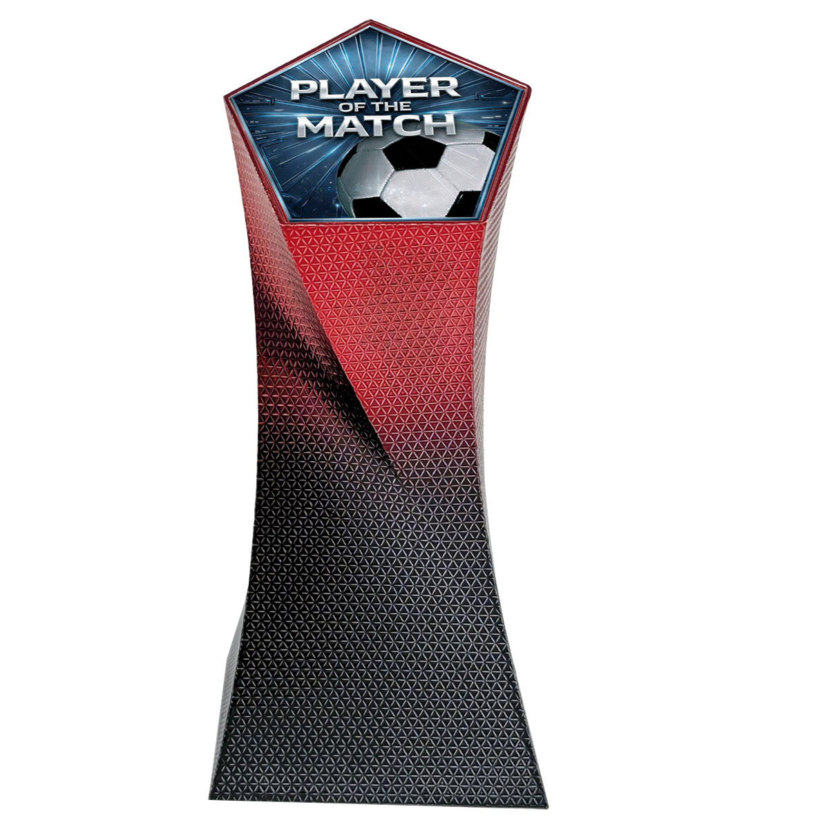A striking and stylish large modern heavyweight hard shell football trophy with a red 5 sided column. With an eye-catching premium look this sleek black and red award is a smart presentation trophy. Player of the Match decal on the top.