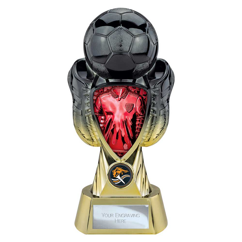 Tournament boot and ball trophy 245mm in carbon black and gold with red shield. Engraved plate and club logo can be applied to the front. Evenly weighted hard scratch proof plastic shell.