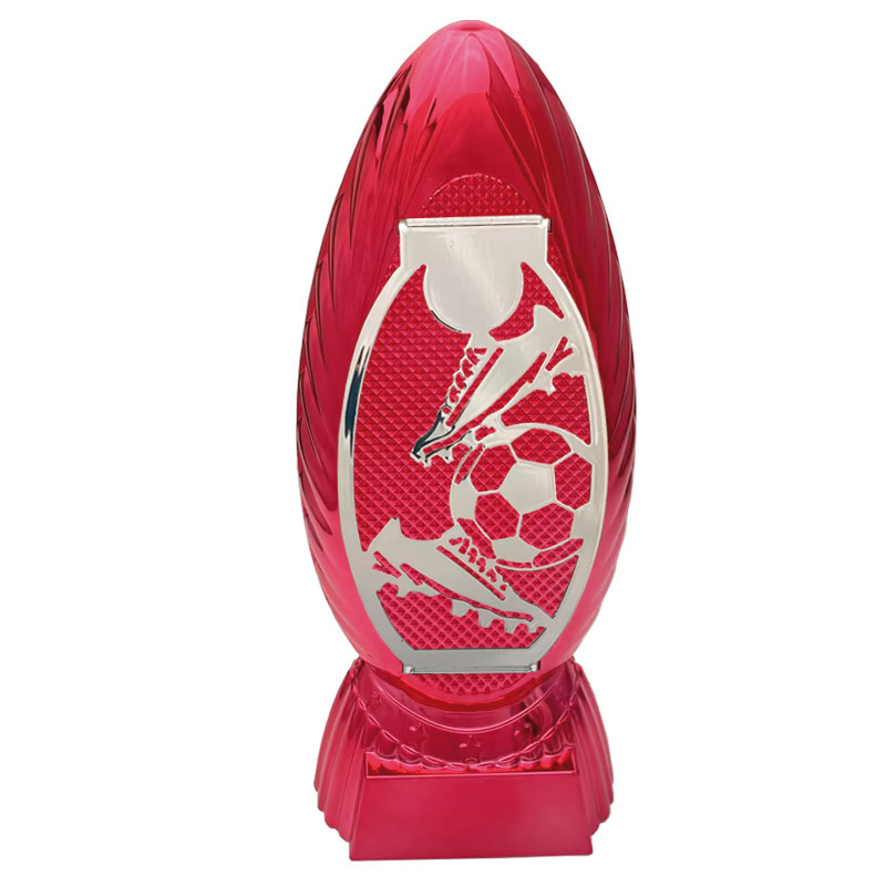 Red and silver heavyweight Dominator Football Trophy 230mm. Fully round hard coloured shell outer with space for an engraved plate and club badge. Versatile silver football boot and ball laser cut metal front.