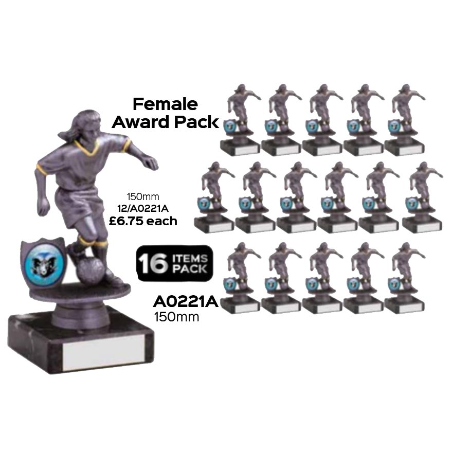 The antique silver female plastic trophy retails at £6.75 each.