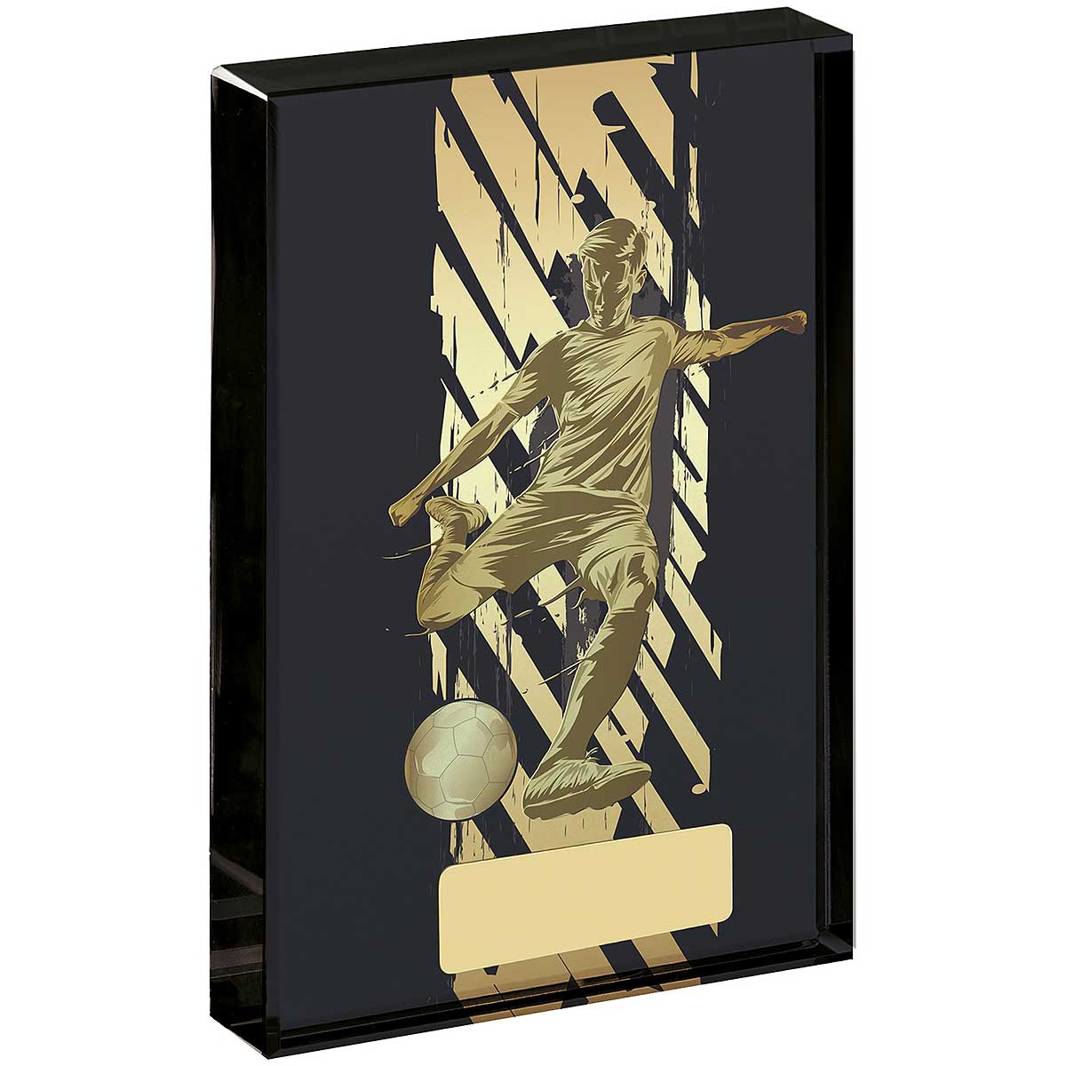 Celebrate the goal of the season with this unique smoked glass award. Features a free standing quality glass block with a gold and silver goal striking figureGold 51mm name plate.