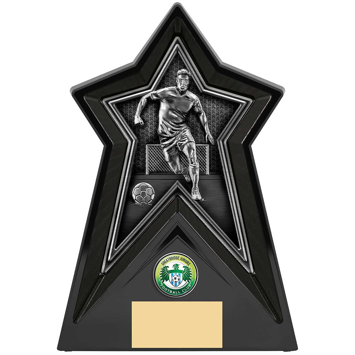 20cm black Starforce stands proud and sturdy with a large star shapeHigh relief insert with male footballerEngraving plate and club logo can be applied.