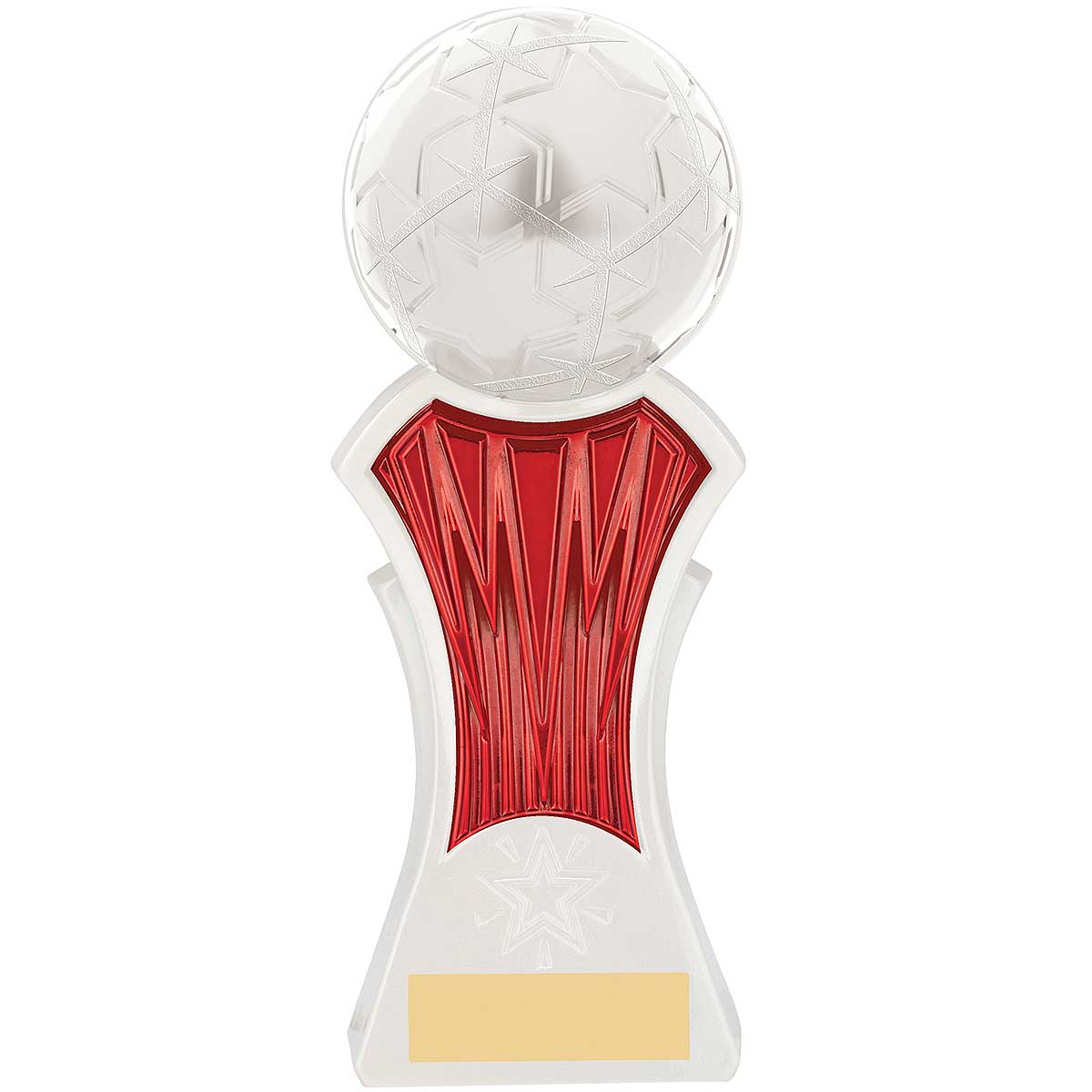 Strike Force Metallic Football Trophy. Stands 19cm tall on a white and red column. Engraving plate and club logo can be applied.