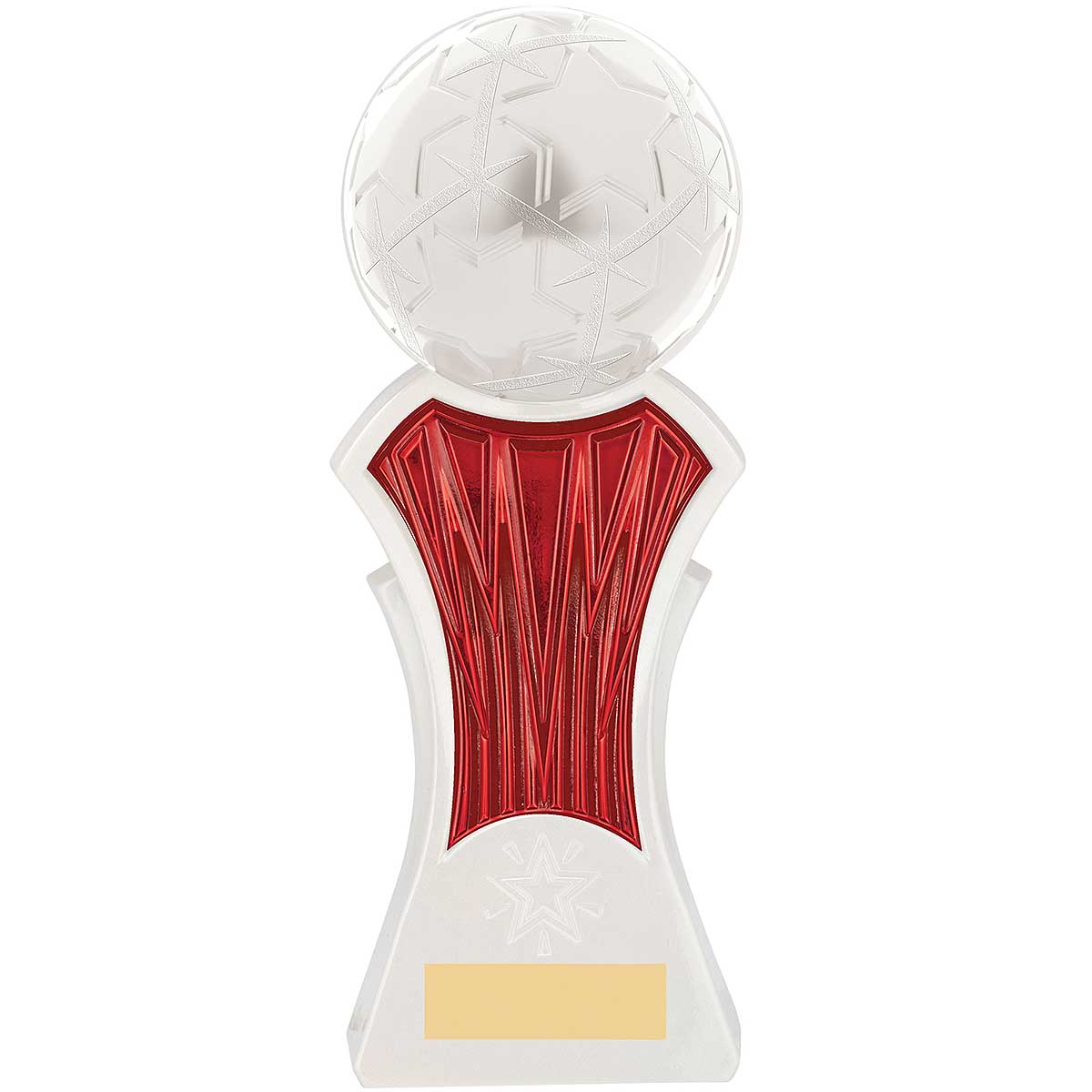 Strike Force Metallic Football Trophy. Stands 22cm tall on a white and red column. Engraving plate and club logo can be applied.