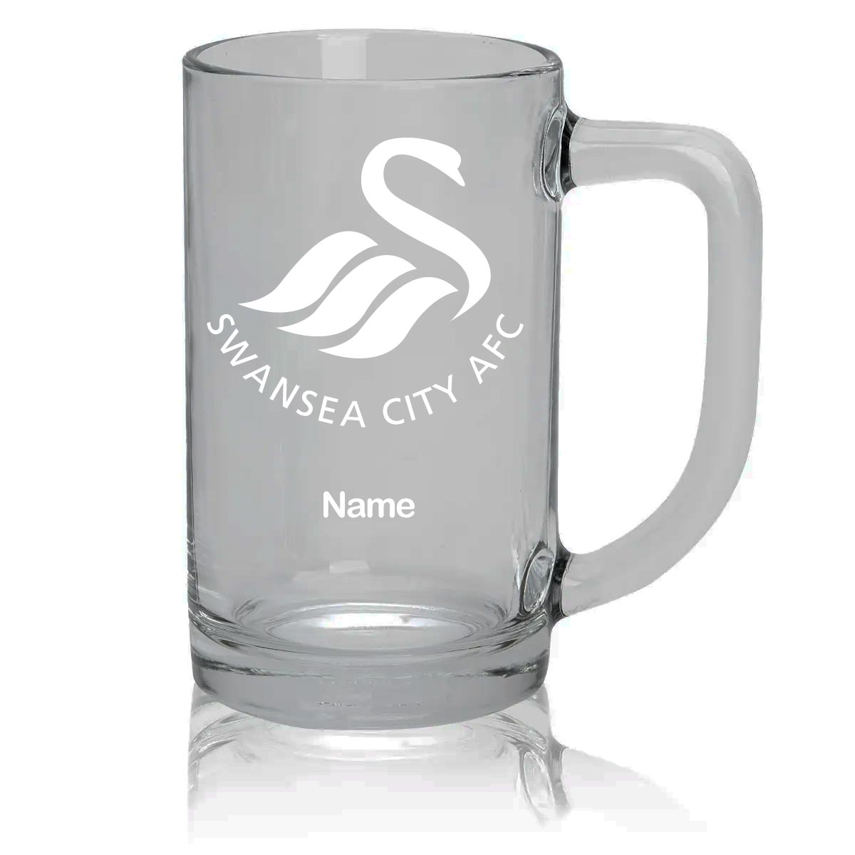 Seamless glass tankard with 440ml full beer can capacity.High-quality Swansea City FC logo and your name engraved into the glass.Dishwasher safe glass engraving that does not fade or splinter.1 pint is 568ml.