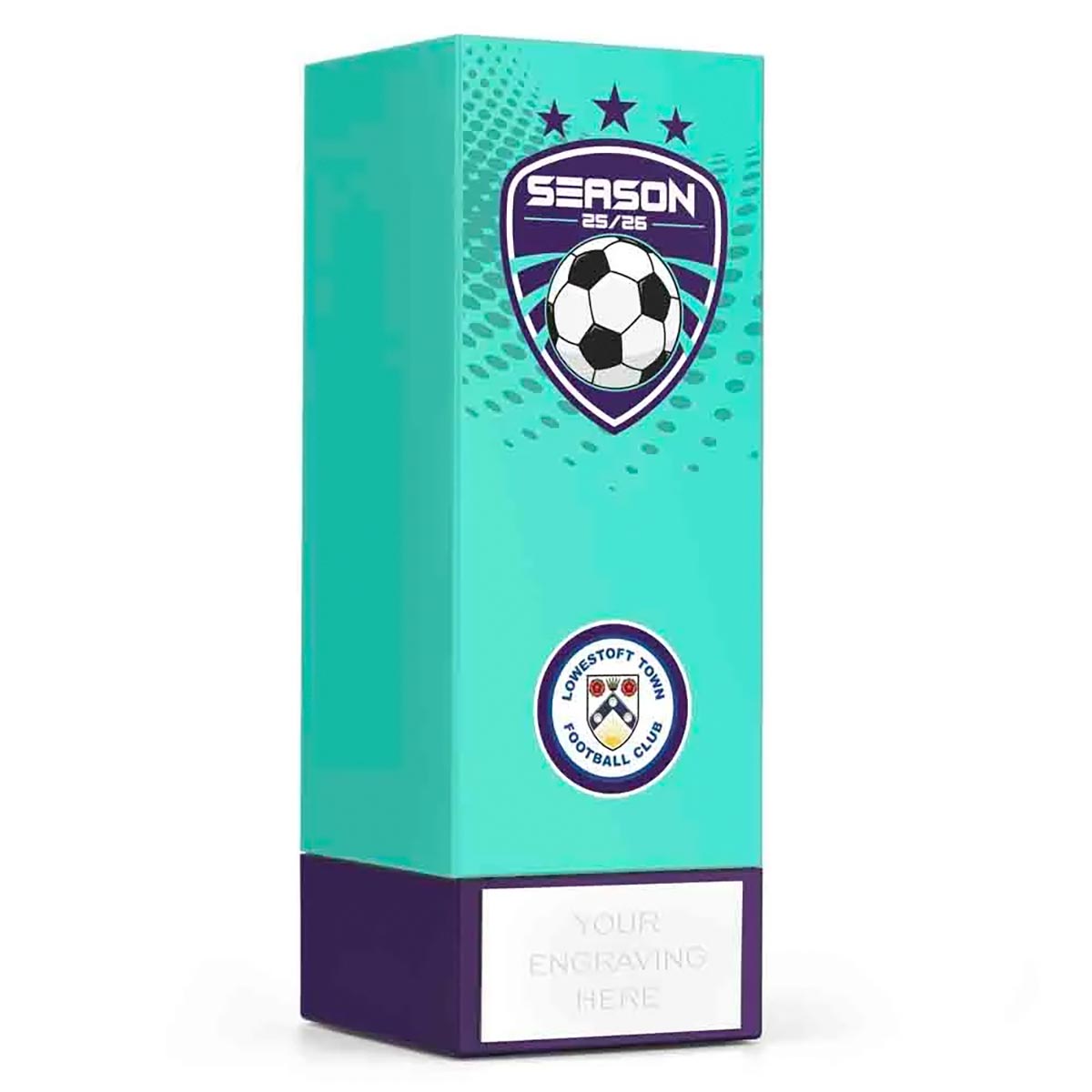 Teal Geo Block 6cm square plain plastic column, 17cm tall. Weighted 0.6kg purple base to give it a quality feel with felt foot.Comes with Football Shield highlight panel