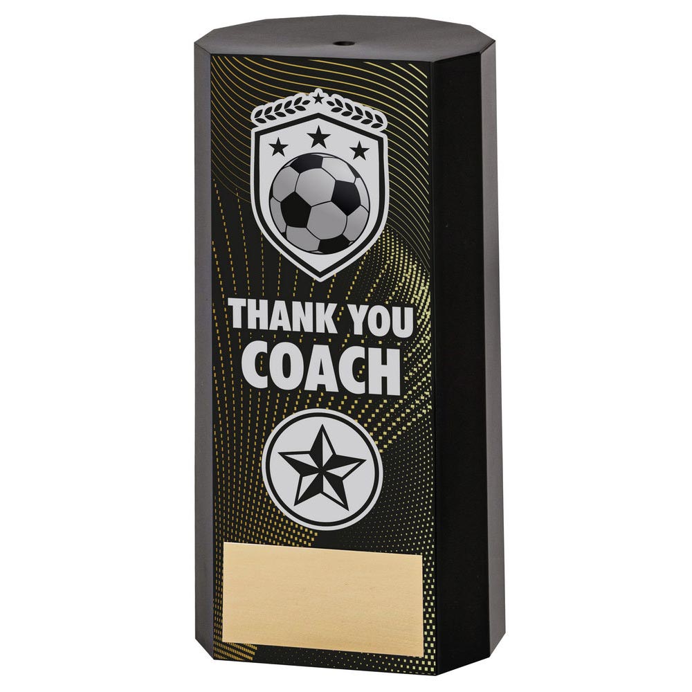Thank You Coach black block football trophy 152mm tall. evenly weighted 0.6kg block to give it a quality feel.Chiselled angled edges for a modern look with football shield and laurel motif.Space for your club badge and engraved name plate.