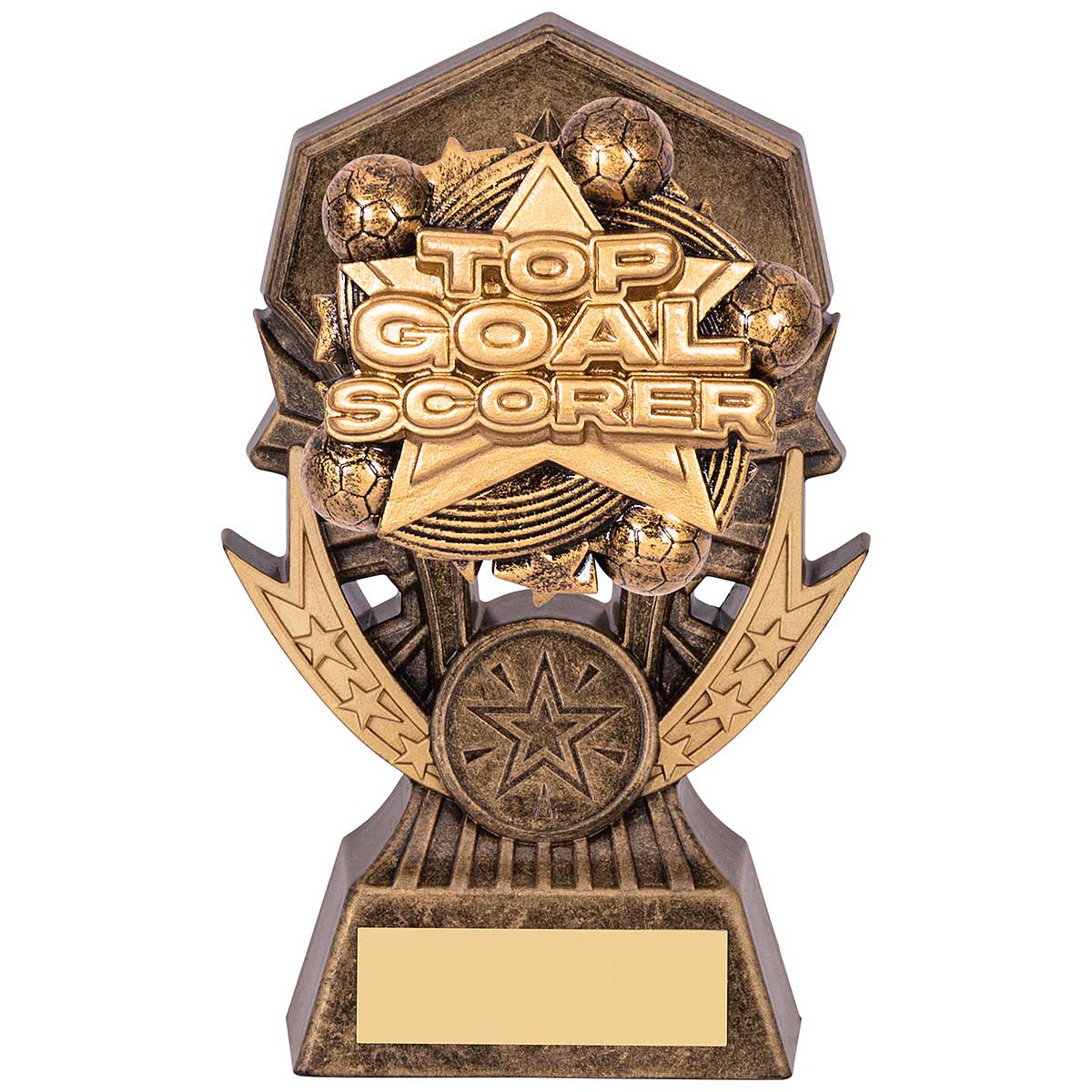 Gold Allstars Top Goal Scorer award 145mm highFeatures gold ball scene background with Players Player textEngraving plate and club logo options