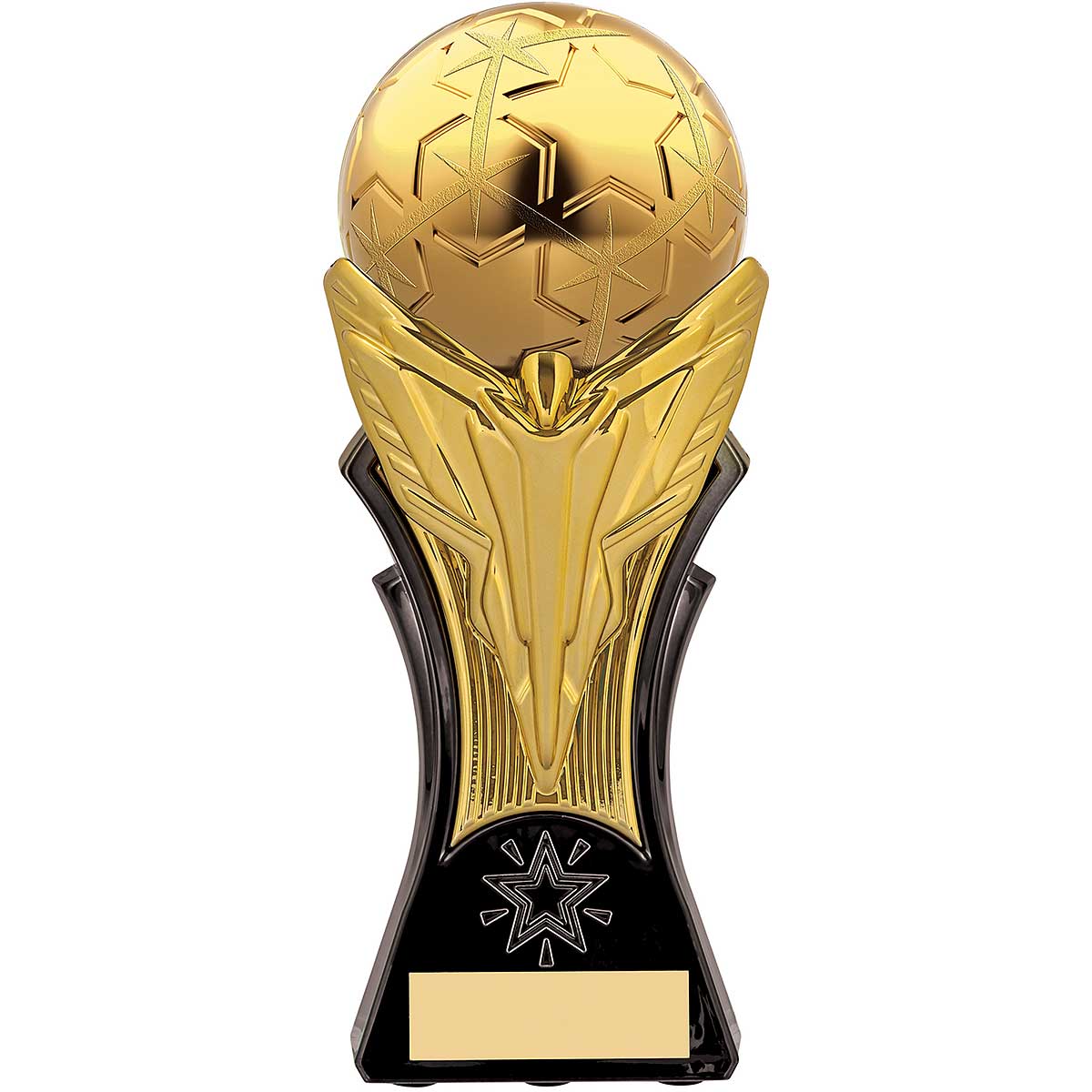 Victory Strike Metallic Gold Football Trophy. Stands 19cm tall on a black and gold column. Engraving plate and club logo can be applied.
