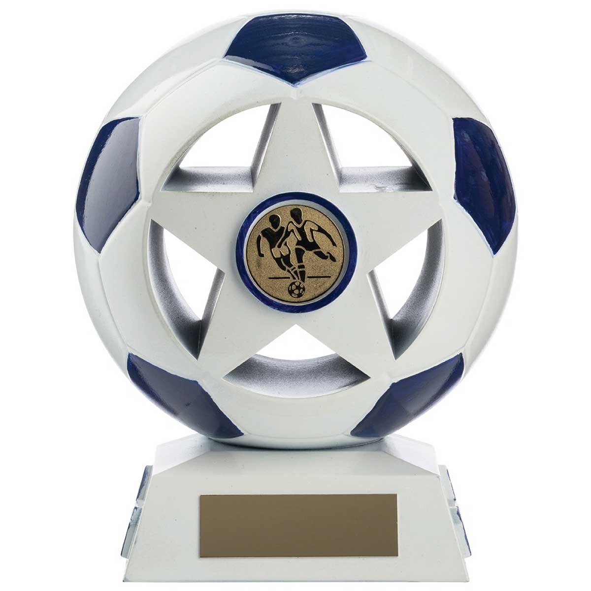 Nova Focus white ball trophy 145mm on a shiny hard shell with blue ball patch. Engraved plate and club logo options.