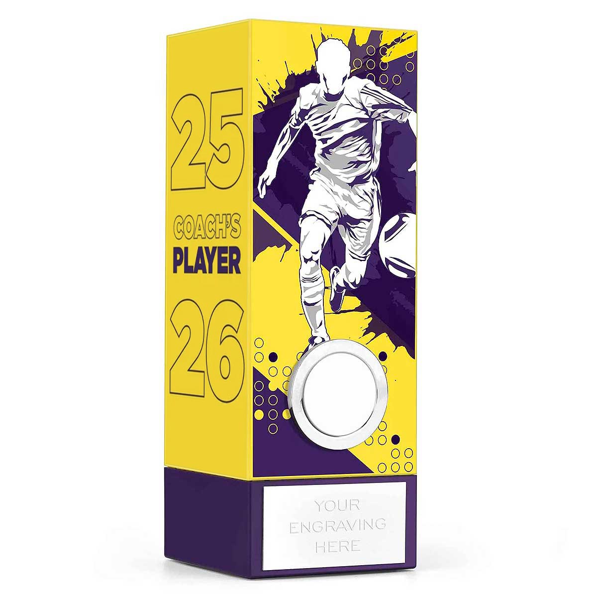 Yellow Geo Block 6cm square plain plastic column, 17cm tall. Weighted 0.6kg black base to give it a quality feel with felt foot.Comes with Male Coach's Player highlight panels