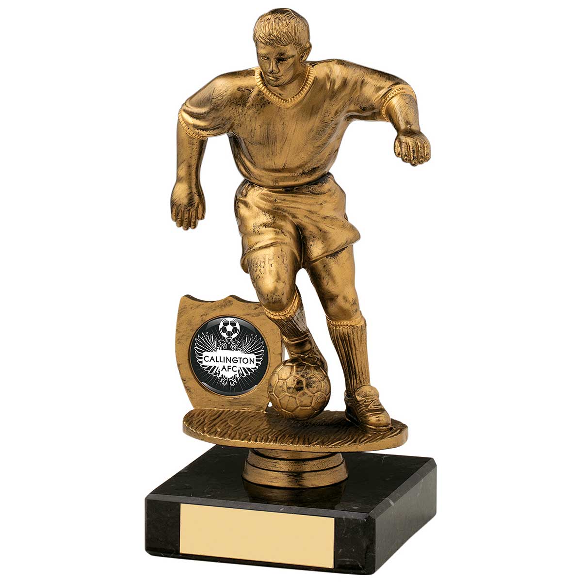 17cm high Male Football Figure in gold plasticFeatures gold male footballer with ball and shieldStands on a black plastic baseEngraving plate and club logo can be applied to front
