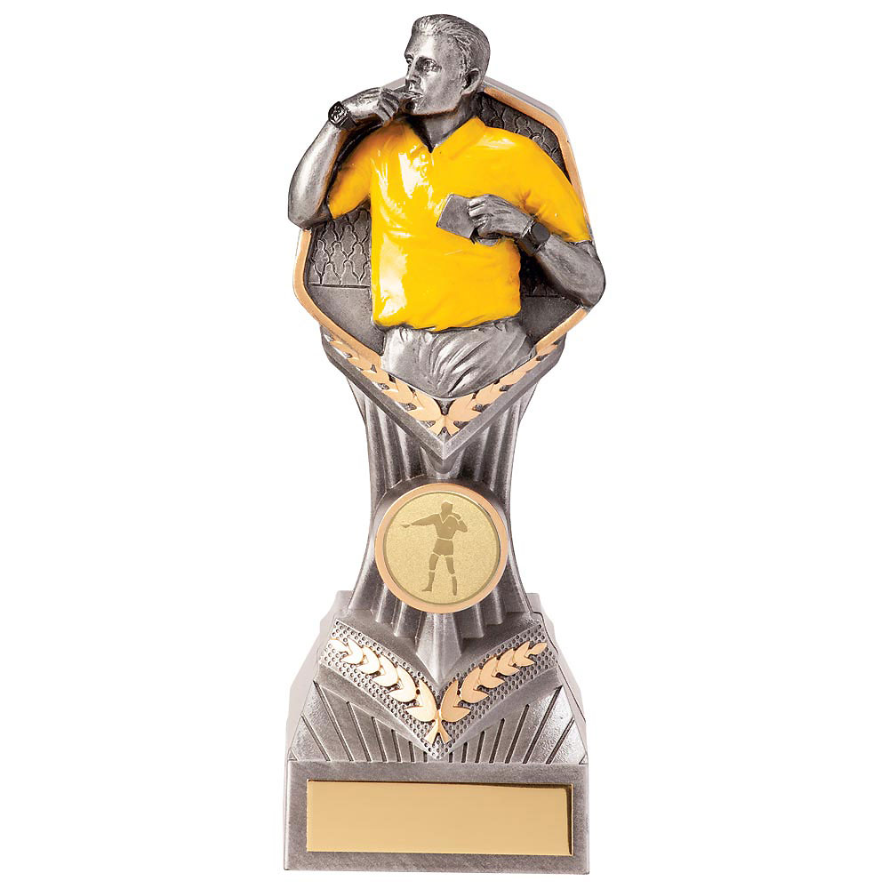 Falcon Football Referee Award in resin 190mm highFeatures silver referee with whistle and card wearing yellow shirtStands on a silver and gold column and baseEngraving plate and club logo can be applied to frontAlternative code: FA4074C