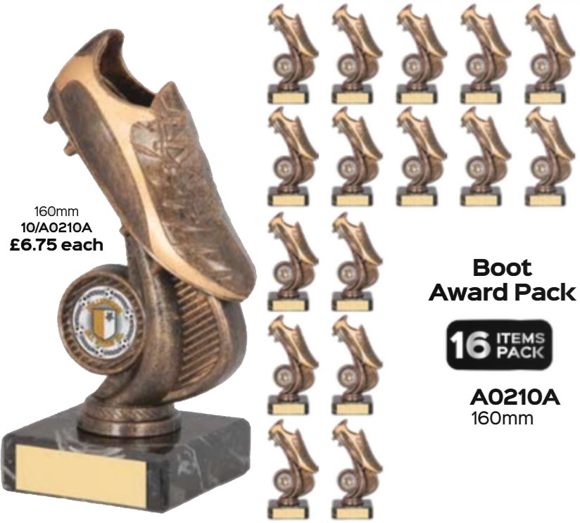 The antique gold & satin gold plastic boot trophy retails at £6.75 each.
