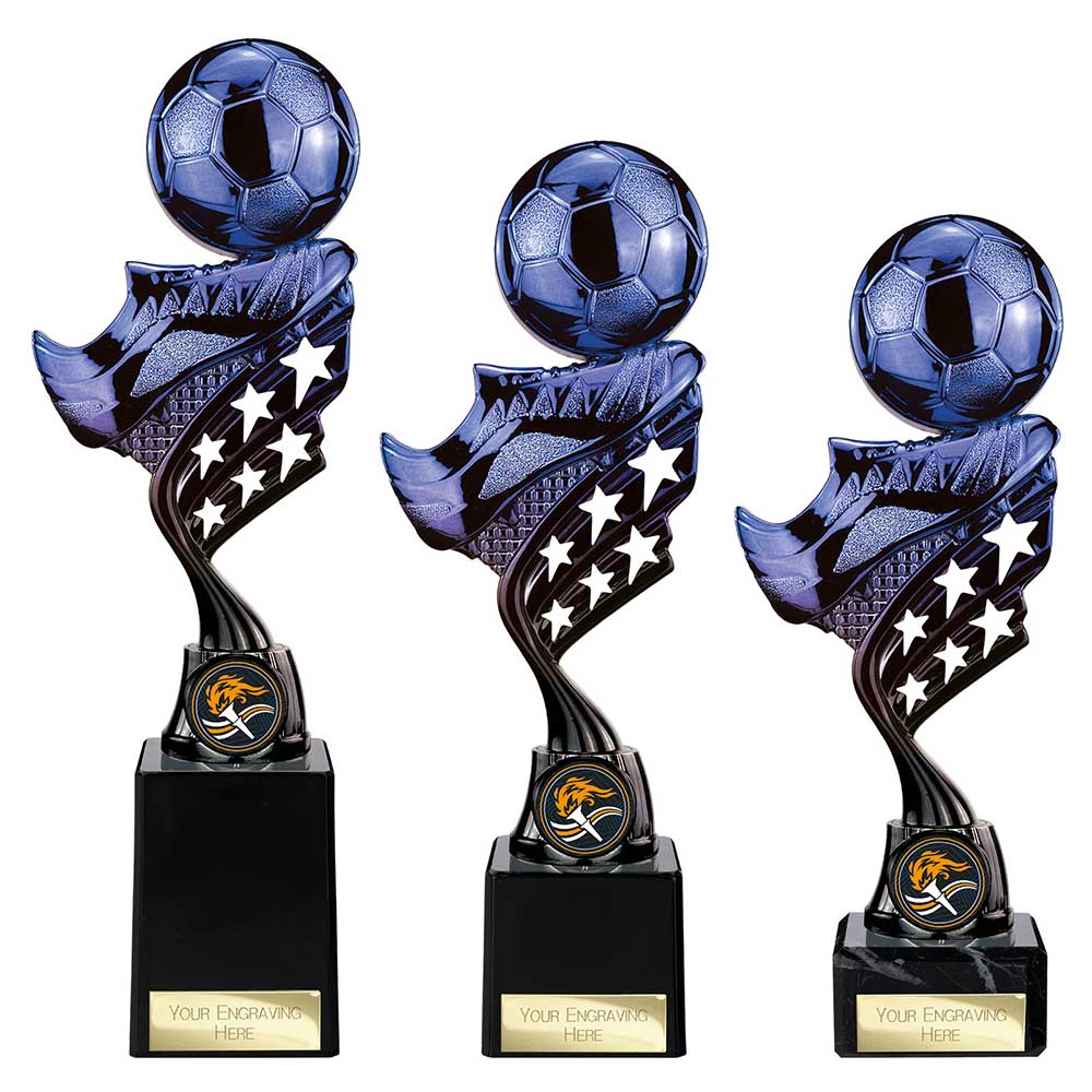Bluw and black Innov8 Football Trophy 230mm Black plastic star column on a black marble base Engraving plate and club badge can be added to the front