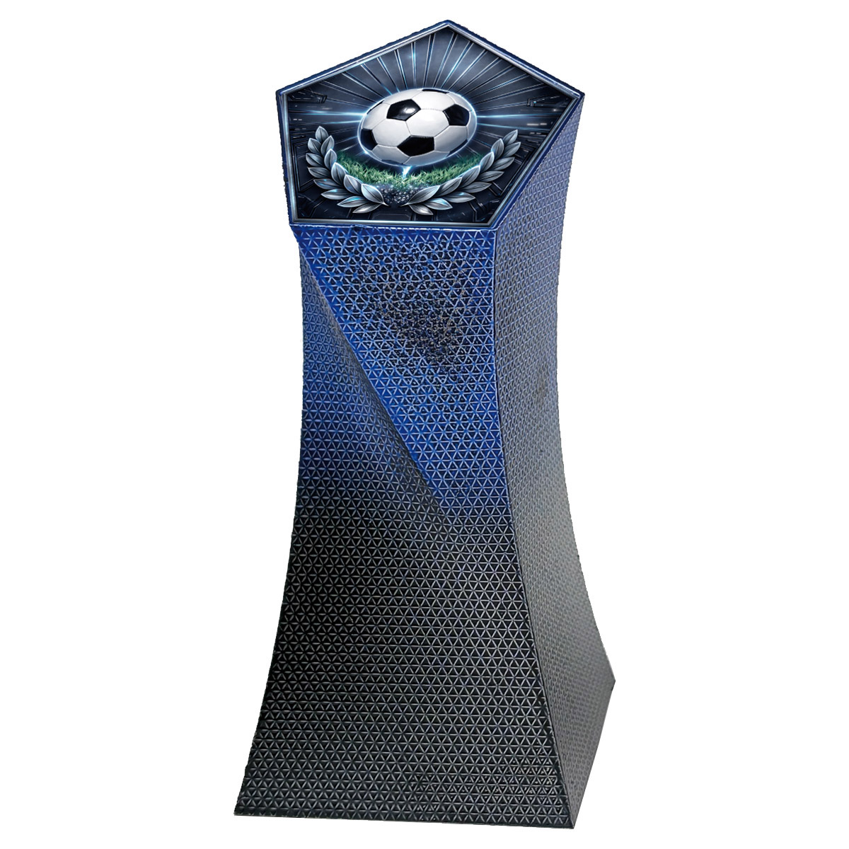 A striking and stylish large modern heavyweight hard shell football trophy with a blue 5 sided column. With an eye-catching premium look this sleek black and blue award is a smart presentation trophy. Choose your football insert or design your own.