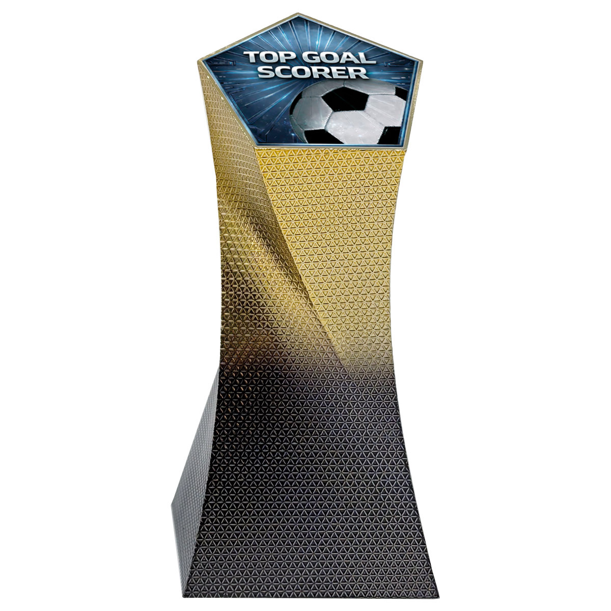A striking and stylish large modern heavyweight hard shell football trophy with a blue 5 sided column. With an eye-catching premium look this sleek black and gold award is a smart presentation trophy. Top Goal Scorer decal on the top.