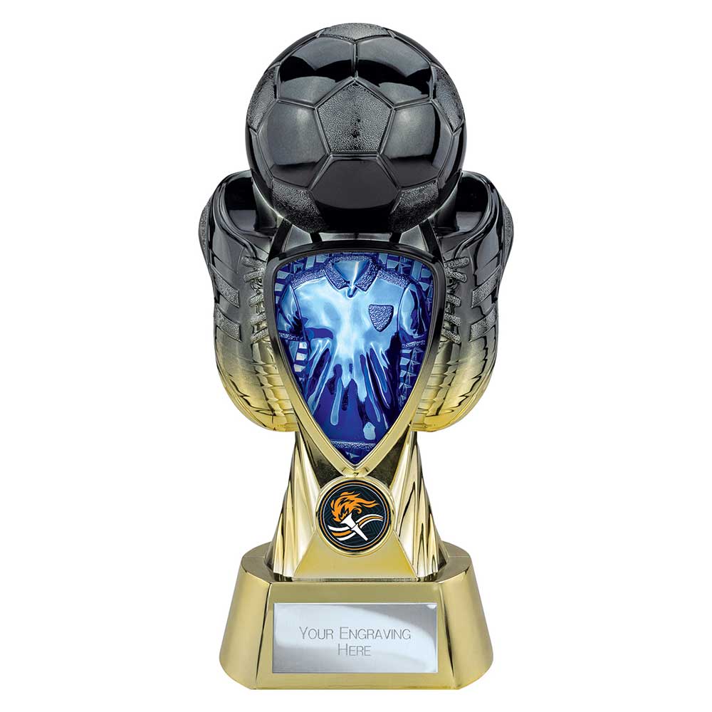 Tournament boot and ball trophy 280mm in carbon black and gold with blue shield. Engraved plate and club logo can be applied to the front. Evenly weighted hard scratch proof plastic shell.