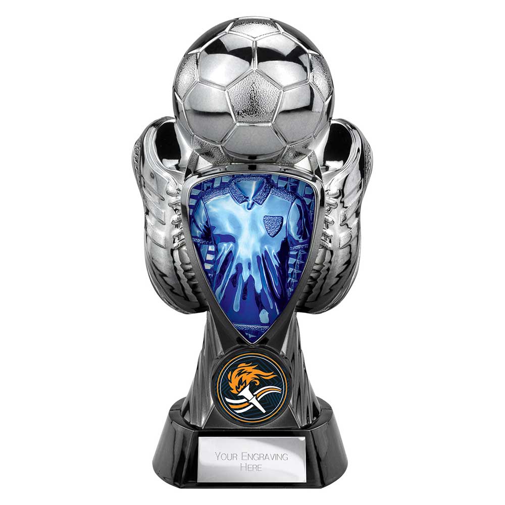 Tournament boot and ball trophy 170mm in gunmetal black and blue shield. Engraved plate and club logo can be applied to the front. Evenly weighted hard scratch proof plastic shell.