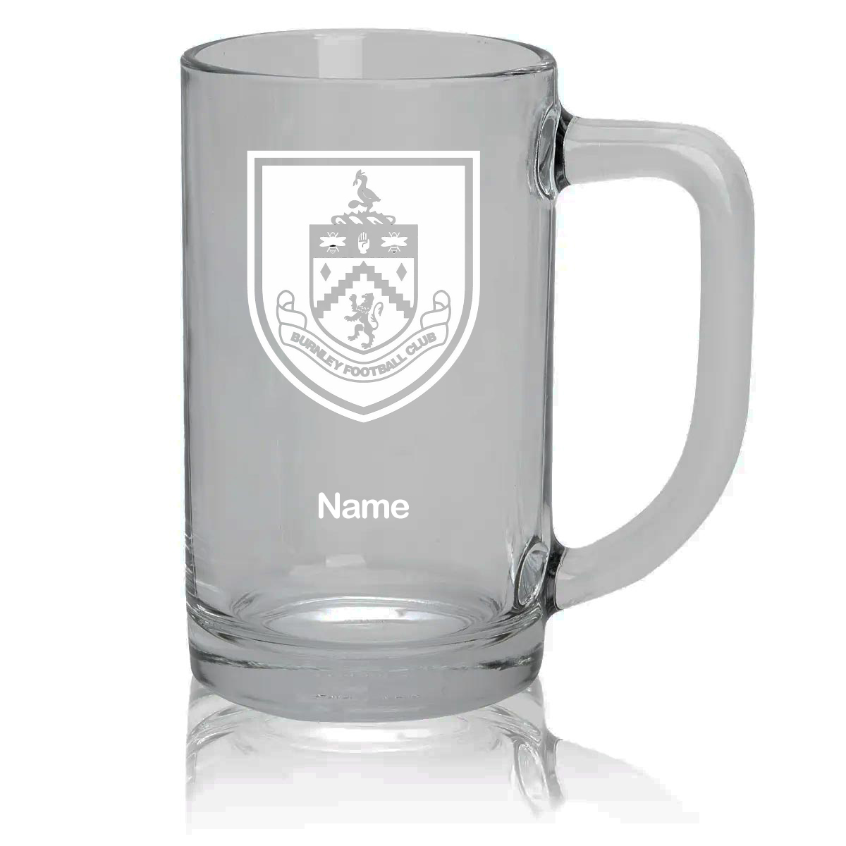 Seamless glass tankard with 440ml full beer can capacity.High-quality Burnley FC logo and your name engraved into the glass.Dishwasher safe glass engraving that does not fade or splinter.1 pint is 568ml.