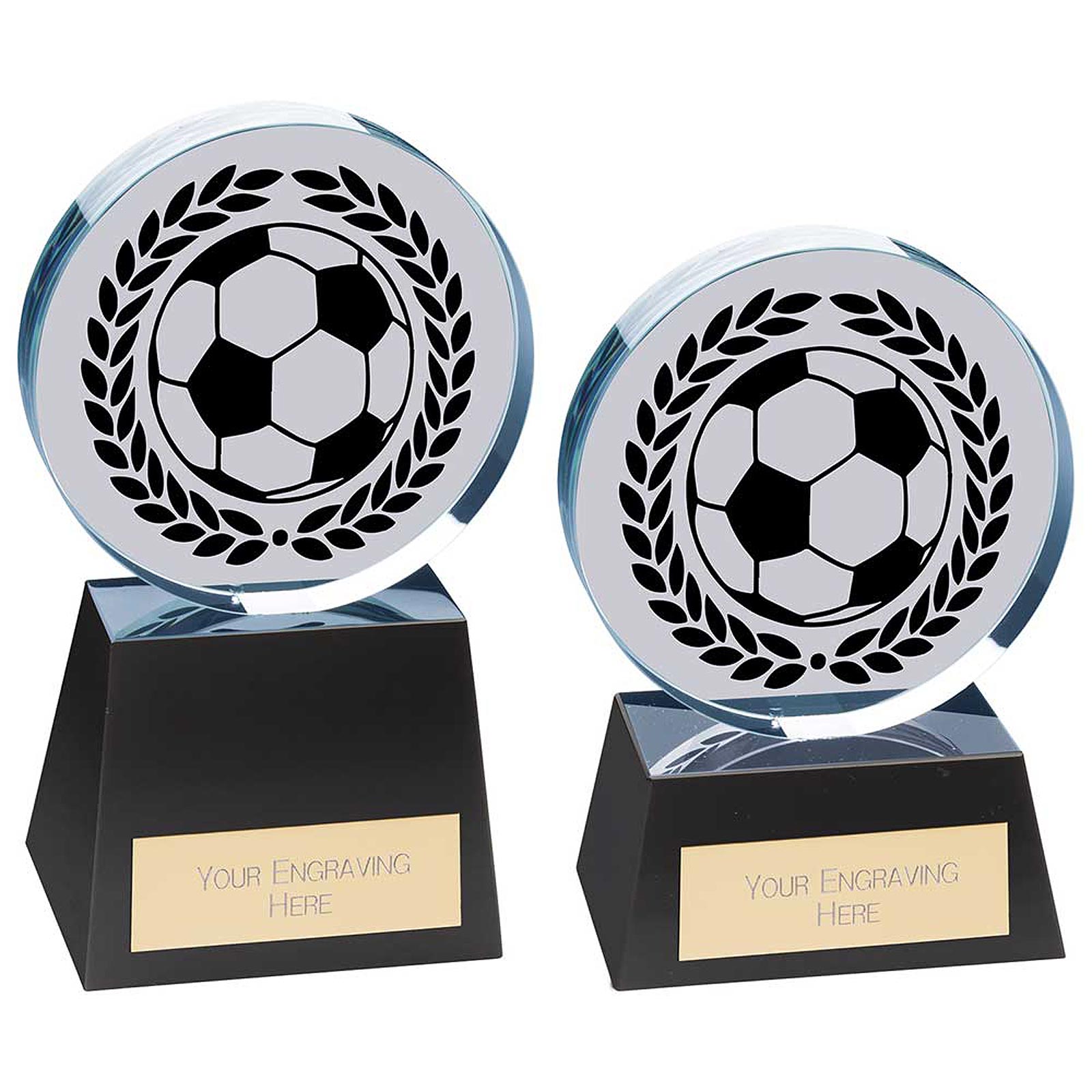 Emperor Football Crystal Award 125mm highFeatures black and clear ball inside laurel leavesSet on angled black crystal baseComes in a presentation boxEngraving plate can be applied to front