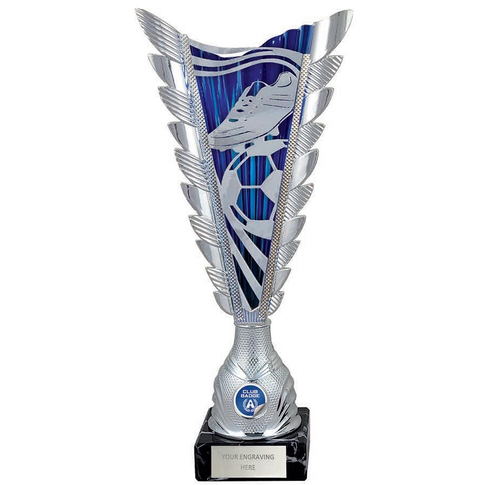 Tall conical blue and silver cup 35cm highFeatures silver metal football boot and ball against metallic backgroundStands on a square black marble baseEngraving plate and club badge can be applied to front