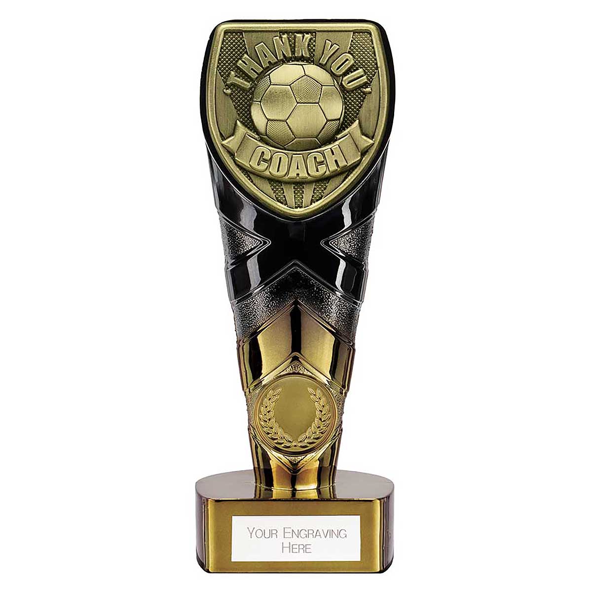 Fusion Cobra Thank You Coach Award 175mmFeatures gold shirt and ball inside detailed gold columnStands on a matching gold baseNon-scratch hard shell finishEngraving plate and club badge can be applied to front
